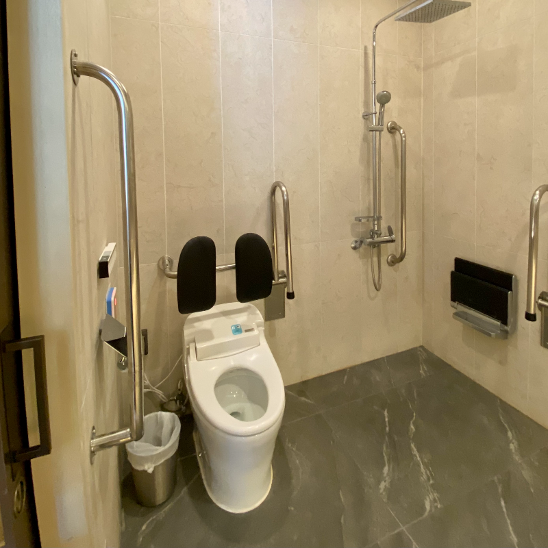 아주 큰 사이즈의 화장실로 기본적인 안전바, 등받이, 샤워 의자 등이 있습니다