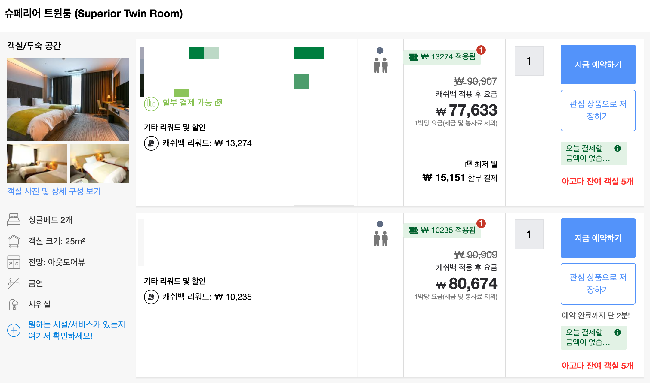 저는 몇 군데를 비교하고 아고다에서 최적가로 결제했는데요! 슈페리어 트윈룸을 기준으로 무료취소 불가 상품은 약 8만원에 이용할 수 있으니 가성비가 좋네요!