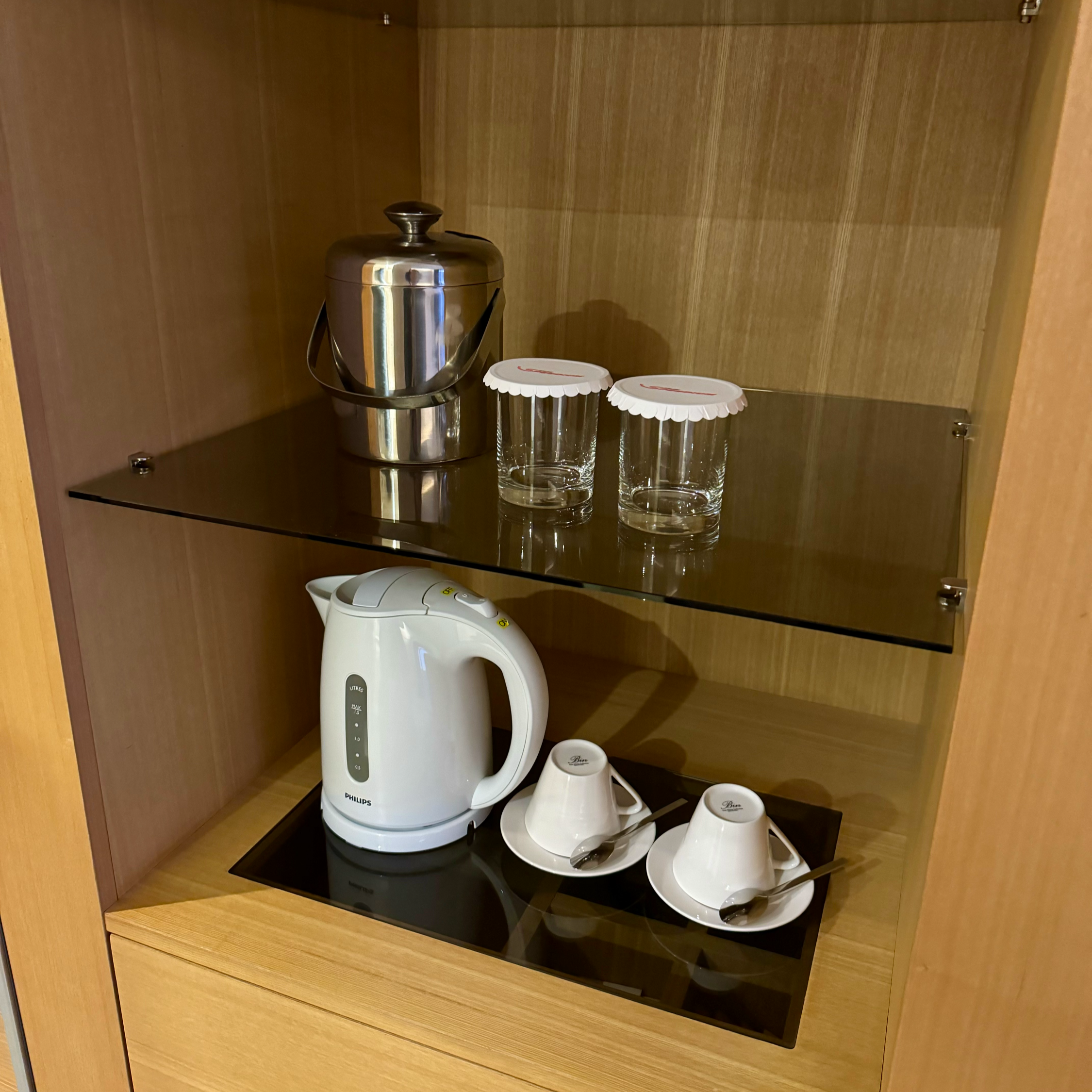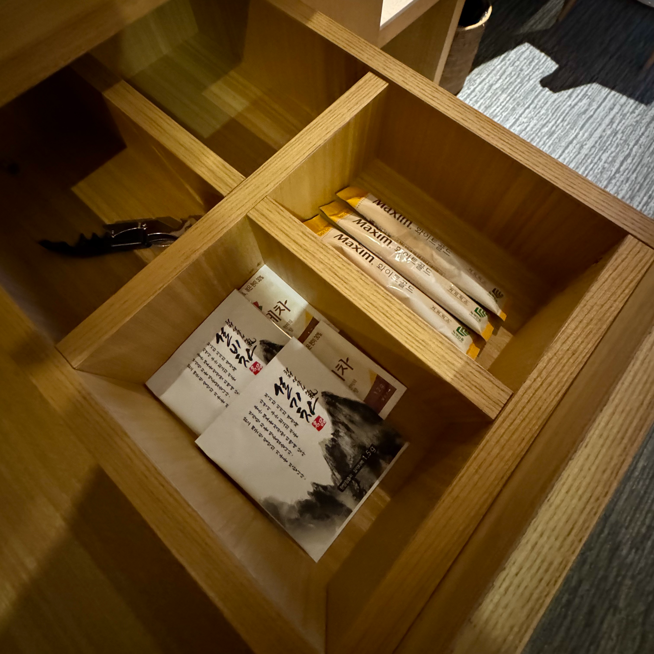 냉장고에 생수 2병, 녹차와 커피등이 준비되어 있습니다.