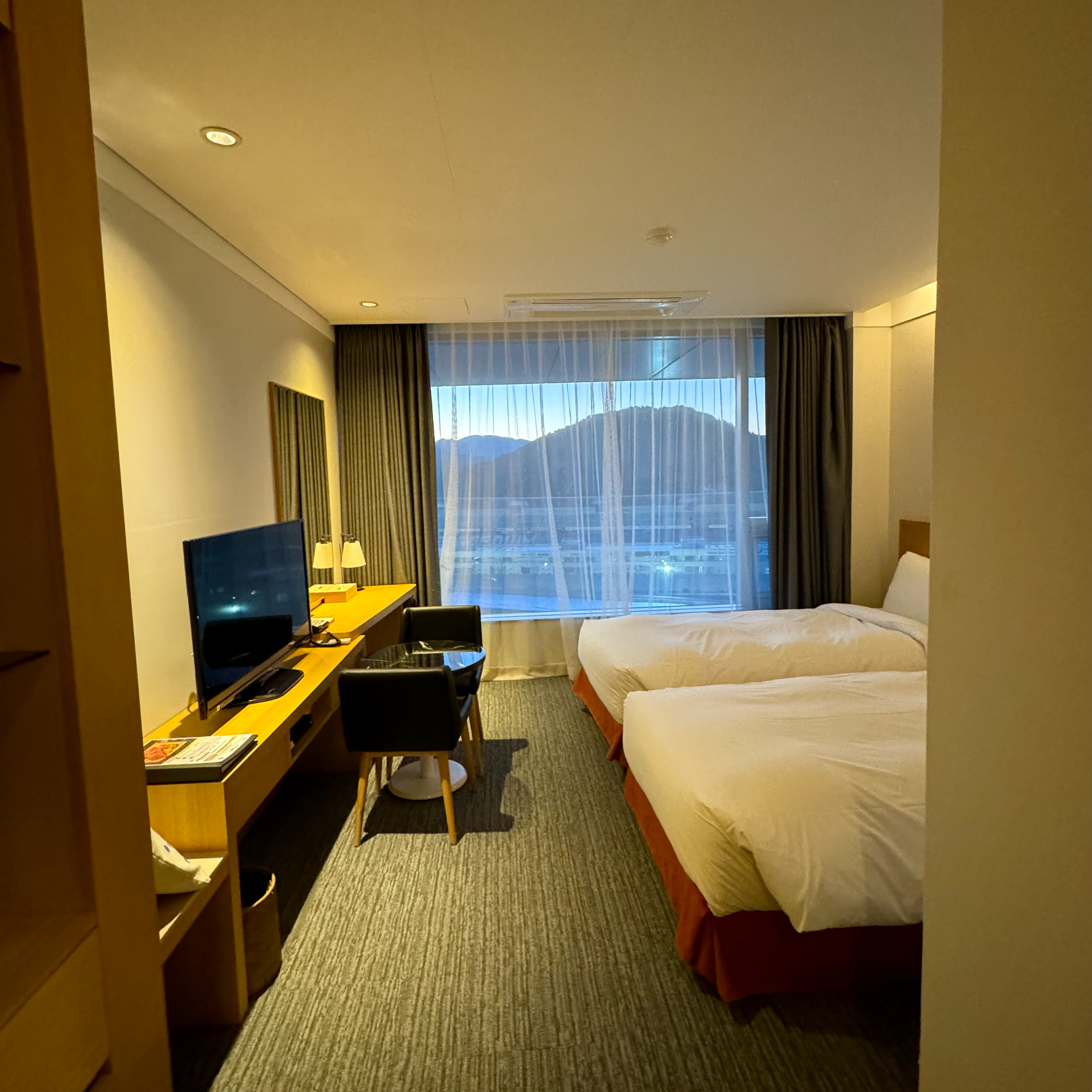 - 장점: 객실은 청결했고, 샤워부스에 샴푸와 바디워시 등이 비치되어 있었어요. 창 밖이 레이싱 서킷이라 구경하는 재미가 있더라고요. 눈이 많이 오니 경치도 좋았어요.