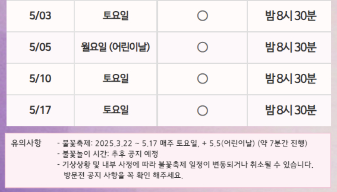 위 날짜는 밤 8시 30분에 붗꽃축제를 진행해요! 약 7분간 봄밤 하늘에 뿌려지는 불꽃까지 구경하시면 즐거운 추억이 되실것 같아요!