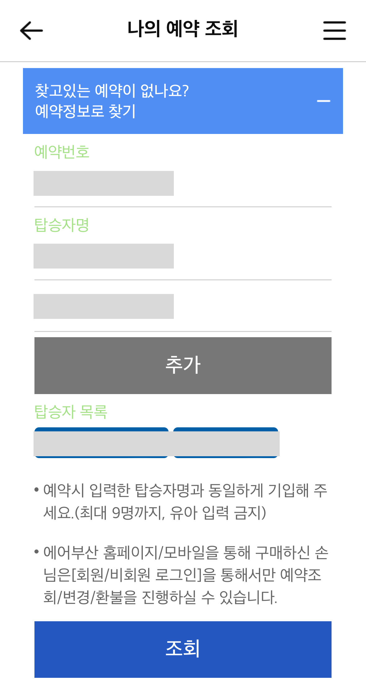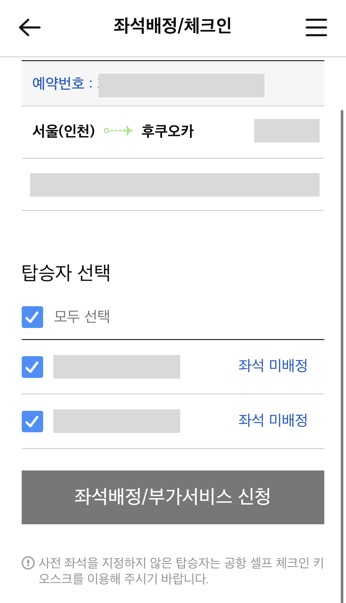 에어부산 앱 → 우측 상단 메뉴 → 예약 조회 → 예약번호 입력 후 조회하면, 탑승자 선택 후 좌석지정 메뉴가 활성화됩니다.