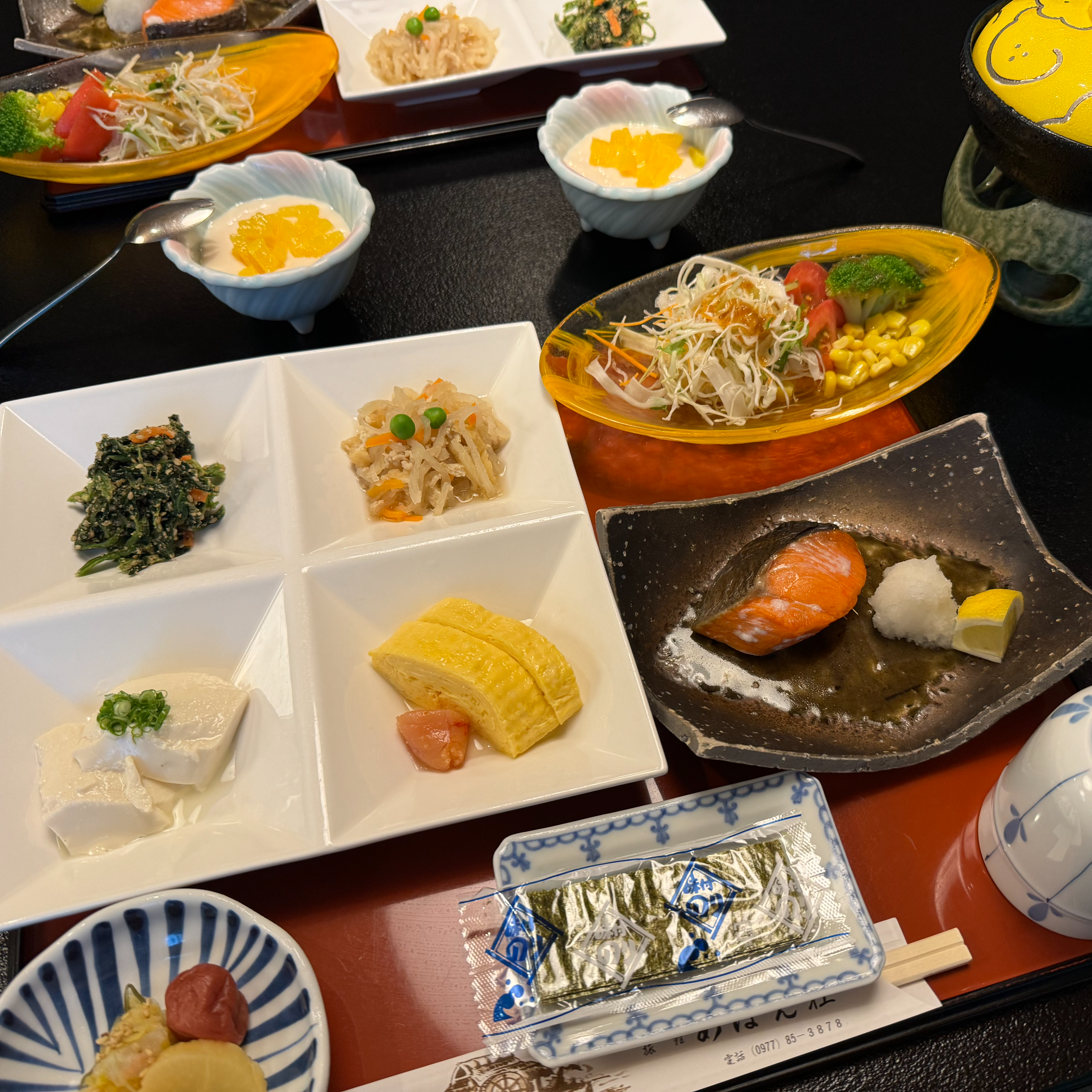 아침 식사는 일본식 정식 한상. 연어구이, 계란말이, 두부, 나물, 샐러드, 요거트 후식까지 아침부터 든든하게 즐길 수 있었어요.