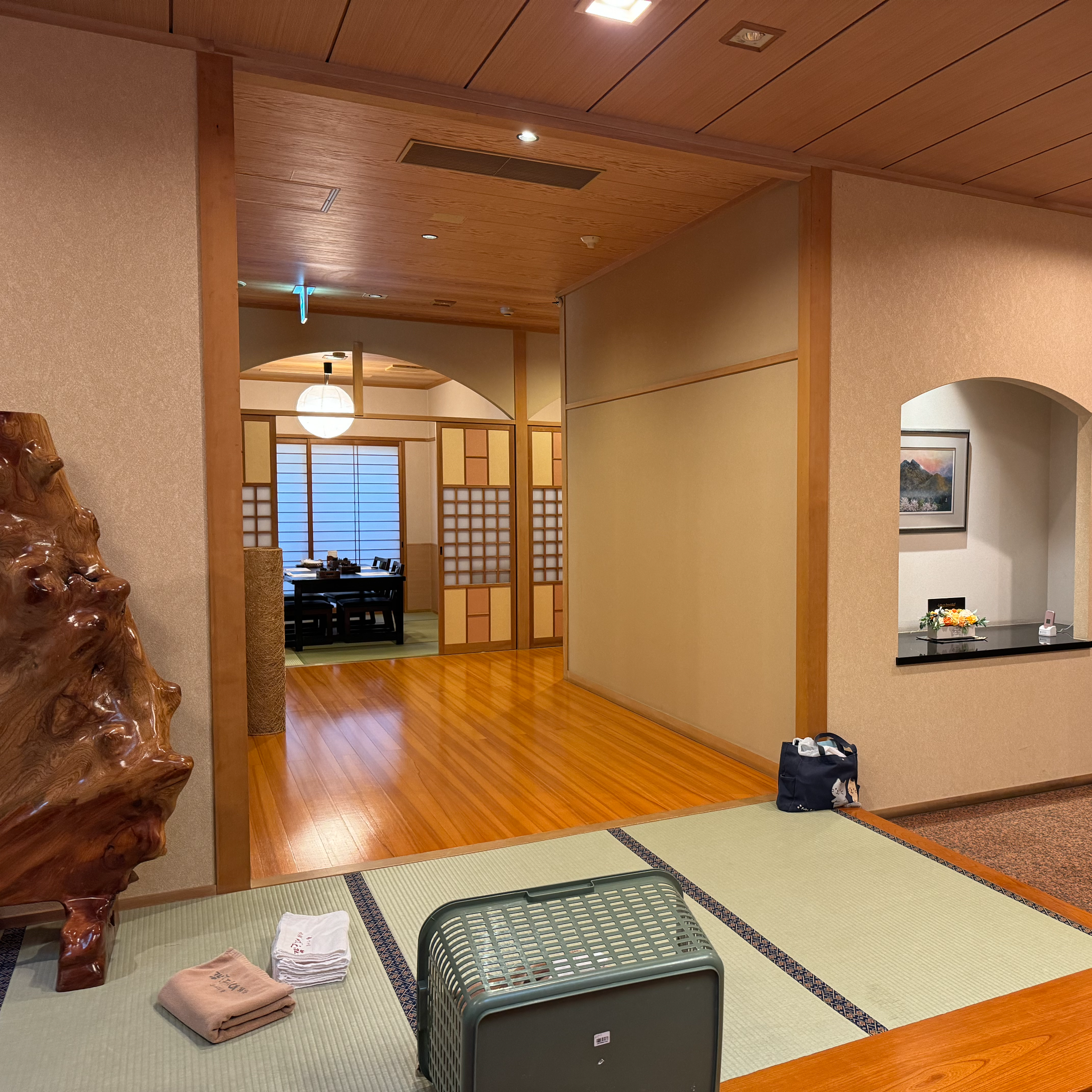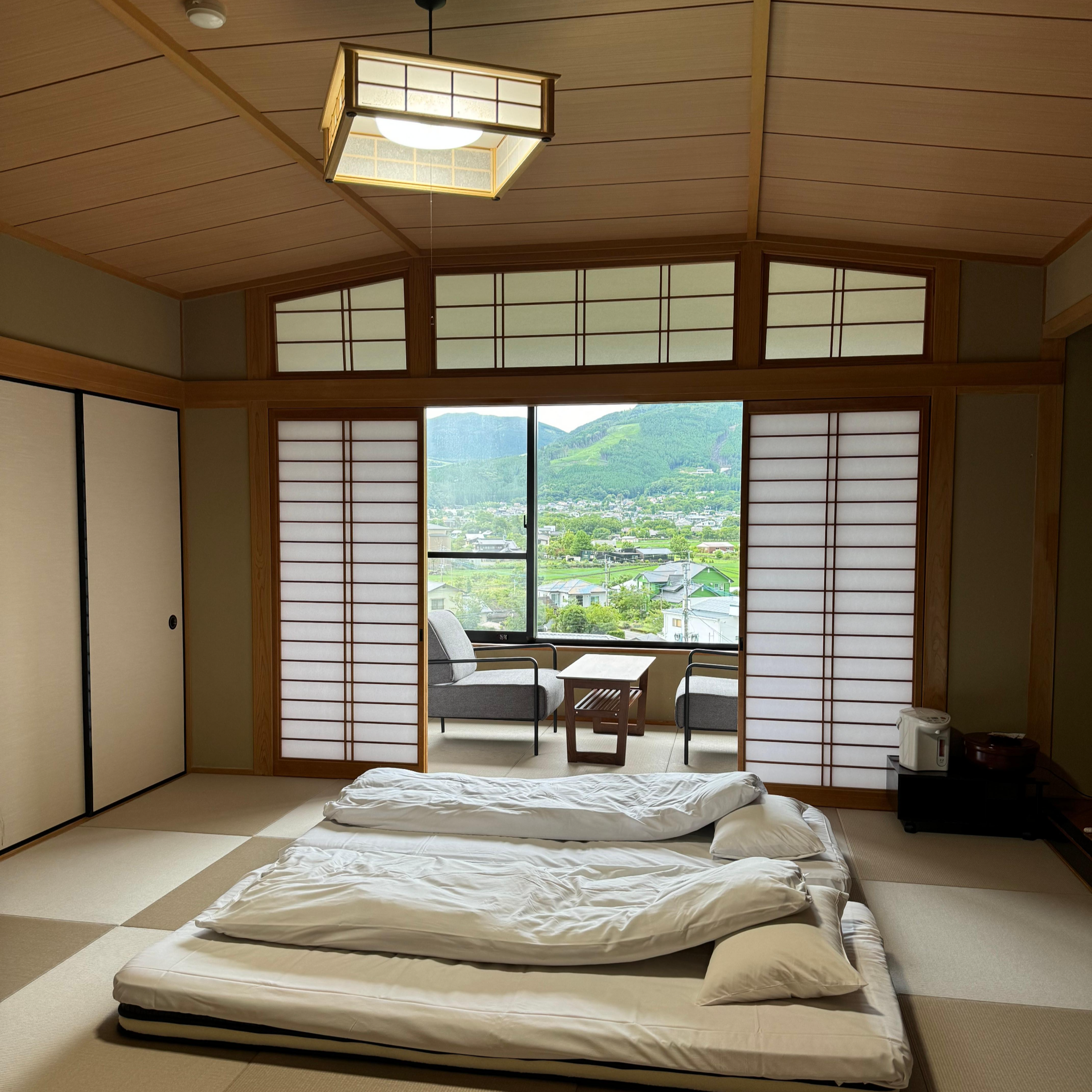 객실은 전통 다다미 구조로 넓고 깔끔했어요. 후톤이 준비되어 있어 푹 잘 수 있었고, 창가 쪽에는 작은 응접실이 있어 여유롭게 뷰를 감상할 수 있었어요.